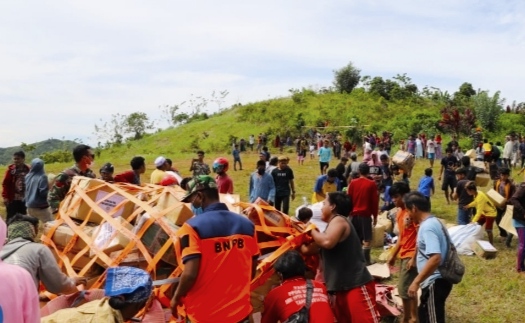 MAMUJU – Warga Desa Popeang, Kecamatan Ulumanda, mendapatkan tambahan bantuan logistik melalui operasi udara helikopter Chinook BNPB pada Jumat (29/1).
