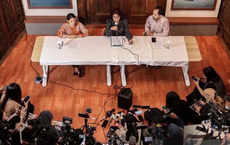 [16.48, 1/3/2023] Iman Handiman: Pemilik Susi Air Susi Pudjiastuti (tengah), Direktur Susi Air Nadine Pascale Kaiser (kiri) dan Kuasa Hukum Susi Air Donal Fariz (kanan) menyampaikan keterangan terkait pembakaran pesawat dan penyanderaan pilot Susi Air Philip Mark Mehrtens. (*)