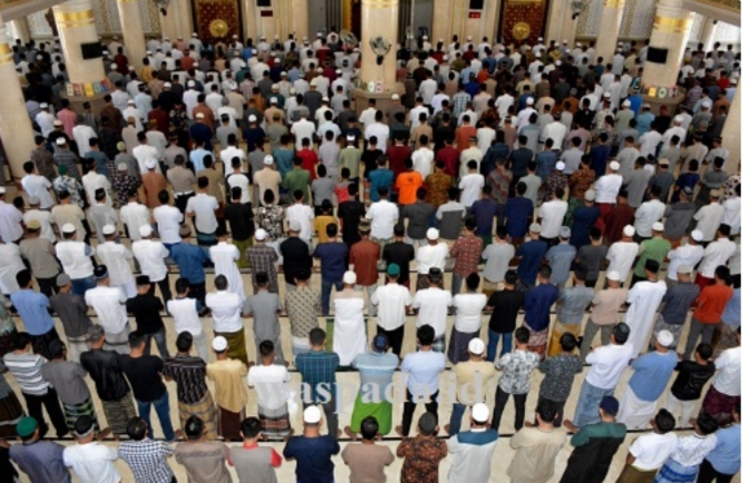 Ilustrasi shalat berjamaah rapat dengan masker. (Foto: wapada/ M Ikhsan)
