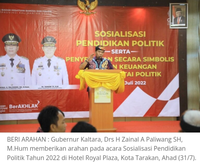 TARAKAN–Gubernur Kaltara Drs H Zainal A Paliwang, SH, M Hum hadir sekaligus membuka acara Sosialisasi Pendidikan Politik Tahun 2022 yang digelar Badan Kesatuan Bangsa dan Politik (Kesbangpol) Provinsi Kaltara. Tujuannya, meningkatkan Stabilitas Politik dan Indeks Demokrasi di Provinsi Kaltara menjelang Pemilu dan Pilkada serentak Tahun 2024.
