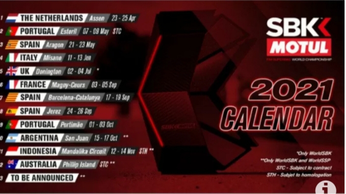 Federasi Motosport Internasional FIM dan Dorna WorldSBK Organization selaku penyelenggara pada Senin merilis kalender sementara penyelenggaraan WorldSBK 2021.