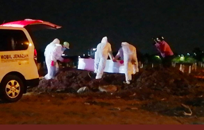 Sampai Sabtu sore, belum diperoleh data korban meningal akibat Covid-19 ini. Yang jelas, sampai Sabtu malam, Pemakaman Tegal Alur, Jakarta Barat, masih terus menerima jenazah untuk dikubur sesuai protokol kesehatan Covid-19.