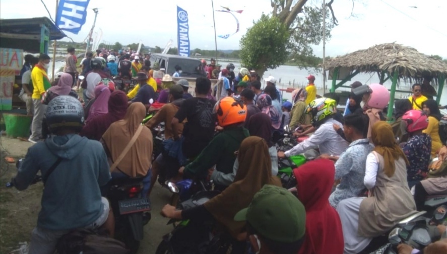 LAMPUNG – Inilah suasana Pantai Mutiara tahun baru 2022. Di pintu masuk objek wisata pantai itu pengunjung berjubel masuk, Minggu (2/1/2022).
