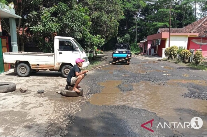 Warga di Kampung Cibentang, Desa Muaracikadu, Kecamatan Sindangbarang, memancing ikan di lubang di tengah jalan provinsi yang rusak parah. (Foto: Antara)