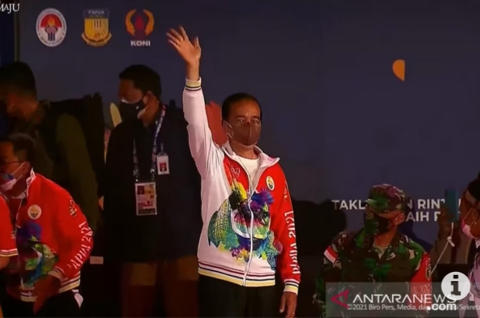 Presiden hadir mengenakan jaket PON XX dengan dominasi warna merah dan putih dan wajah orang Papua, dalam desain grafis dengan warna cerah di bagian depan. Tidak ketinggalan Presiden Jokowi memakai masker warna cokelat muda.