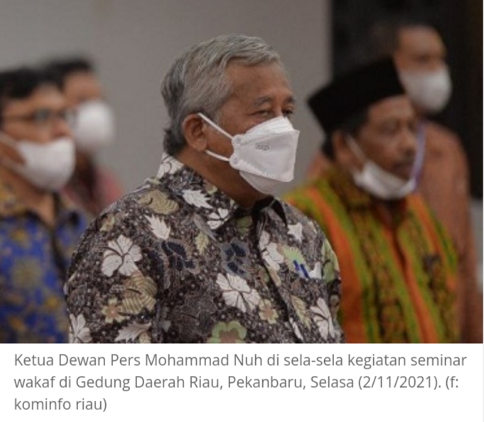 Penegasan itu disampaikan oleh Ketua Dewan Pers Prof Dr Ir Mohammad Nuh, DEA kepada media, usai menjadi pemateri di acara Seminar Wakaf, di Gedung Daerah Riau, Selasa (2/11/2021).