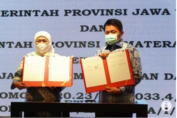 Gubernur Sumsel Herman Deru dan Gubernur Jawa Timur Khofifah Indar Parawansa melakukan penandatanganan nota kesepahaman di Palembang, Sumsel, Rabu (2/12/2020)..