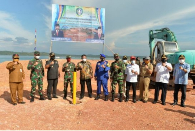Pjs Gubernur Kepri Bahtiar Baharudin bersama Wakapolda Kepri Brogjen Pol Drs Darmawan, Danlantaman IV Laksamana Pertama TNI Indarto Budiarto, Kaskoggabwilham Kogabwilhan I Mayjend TNI Syafruddin, Pjs Walikota Batam Syamsul Bahrum dan Plh Kepala BP Batam Purwiyanto, BPN Kepri dan Sekdaporv H TA Arif Fadillah melakukan pemancangan titik awal lokasi landing point, Selasa (1/12/2020), di Kabil, Batam.