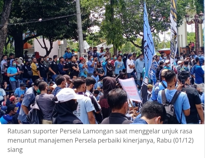 LAMONGAN–Mengalami kekalahan berturut-turut di BRI liga 1, Persela Lamongan kembali didemo oleh ratusan suporternya di depan Kantor Sekretariat Persela, Jalan Lamongrejo, Rabu (1/12/2021).