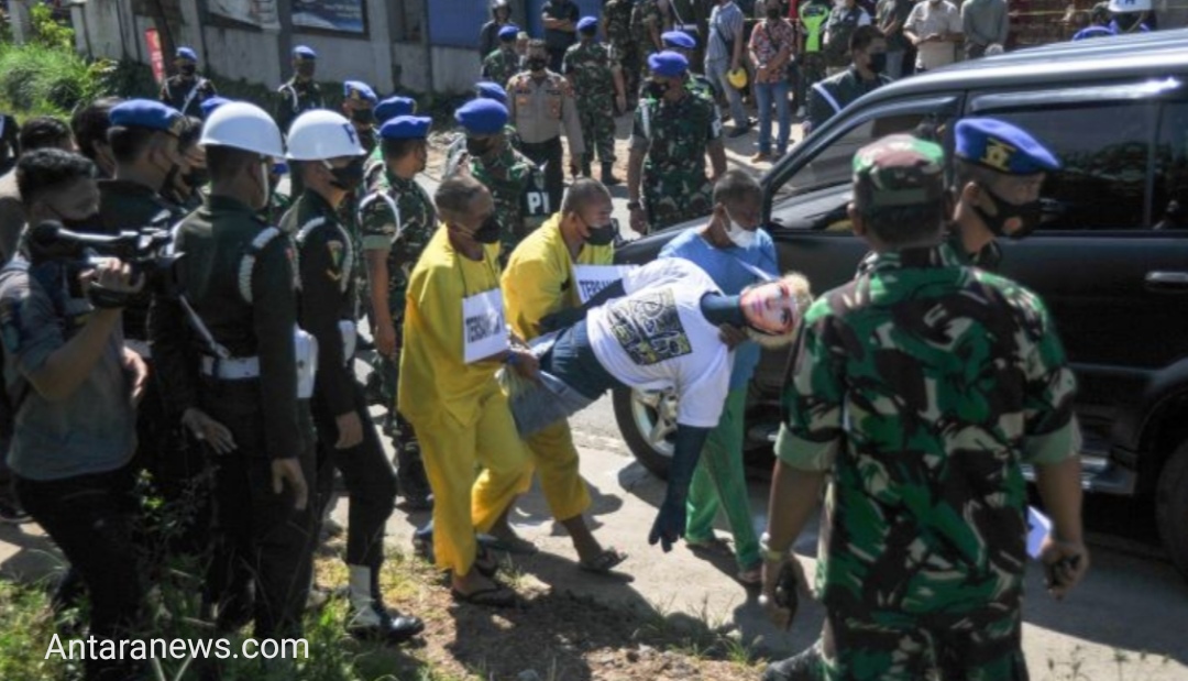 Tiga oknum TNI yang telah ditetapkan sebagai tersangka itu tampak hadir. Mereka memeragakan beberapa adegan.
