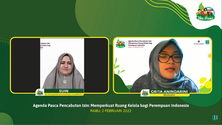 “Saat kecil, di tempat saya marak perambahan hutan. Ayah saya diajak tapi tidak pernah tertarik sama sekali untuk ikut melakukan perambahan hutan,” kata Ibu Suin dalam Webinar Agenda Pasca Pencabutan Izin: Memperkuat Ruang Kelola bagi Perempuan Indonesia, pada Rabu (2/2/2022).