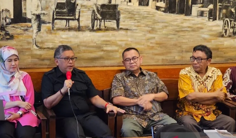 Sejarawan Asvi Warman Adam (kedua dari kanan) dalam acara Bedah Buku: NU, PNI, dan Kekerasan Pemilu 1971 karya Ken Ward di kawasan Cikini, Jakarta, Selasa (2/4/2024). (PDIP)