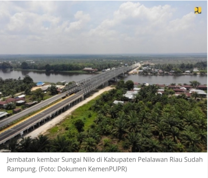 RIAU – Kementerian Pekerjaan Umum dan Perumahan Rakyat (PUPR) telah menyelesaikan pembangunan duplikasi Jembatan Sungai Nilo di Kabupaten Pelalawan, Provinsi Riau.