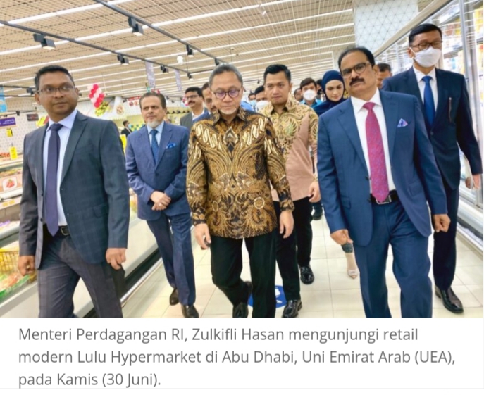 ABU DHABI–Menteri Perdagangan Zulkifli Hasan melakukan kunjungan ke kantor Lulu Group International sekaligus ritel modern Lulu Hypermarket di Abu Dhabi, Uni Emirat Arab (UEA) pada Kamis (30/6).