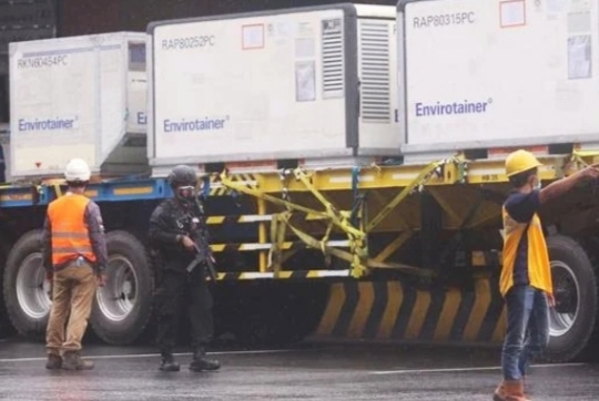 Iring-iringan kendaraan pengangkut vaksin tersebut langsung menuju halaman belakang untuk memindahkan muatan ke gudang farmasi.