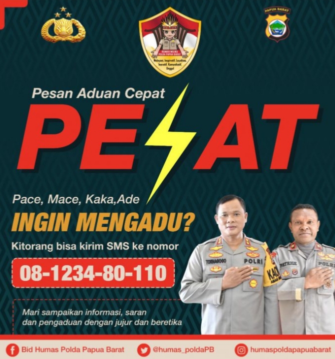 MANOKWARI – Masyarakat Papua Barat diminta tidak sungkan mengadu melalui layanan SMS pengaduan hasil inovasi Polda Papua Barat. Sebab, dipastikan layanan SMS pengaduan itu akan secara cepat ditindak lanjuti.