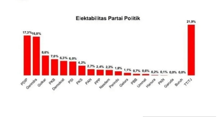 Angka tersebut terpaut hanya 0,5 persen dari PDI Perjuangan yang menduduki peringkat pertama dengan 17,3 persen berdasarkan hasil survei di periode yang sama.