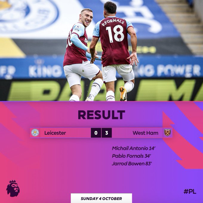 Berkat kemenangan itu, West Ham sementara melompat naik ke peringkat ketujuh dengan koleksi enam poin, sedangkan Leicester (9) tertahan di posisi kedua dan membuang kesempatan untuk kembali ke puncak klasemen.