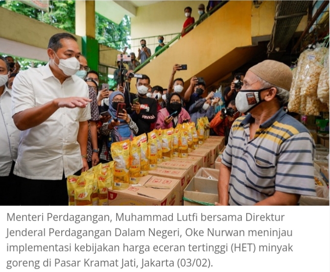 Kepada para pedagang, Mendag Lutfi menegaskan harga minyak goreng di pasar rakyat dan di ritel modern secepatnya harus sesuai dengan HET. Pemenuhan pasokan minyak goreng ke pasar rakyat terus berjalan.