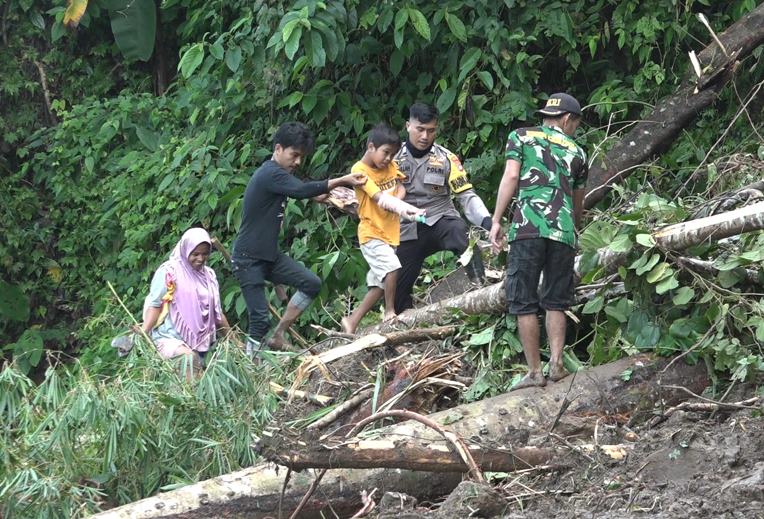 Dibantu personil polisi dari Polsek Tutar, warga yang ingin melanjutkan perjalanan, harus berjuang melewati material longsor yang terdiri dari tanah berlumpur bercampur batang kayu besar. (thaya/sur-paceko)