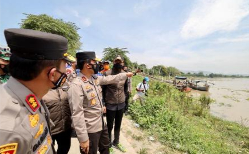 TUBAN – Kapolda Jawa Timur, Irjen Pol Nico Afinta bersama Pejabat Utama Polda Jatim, mengecek tempat tenggelamnya perahu penumpang di sungai Bengawan Solo, Kamis (4/11/2021).