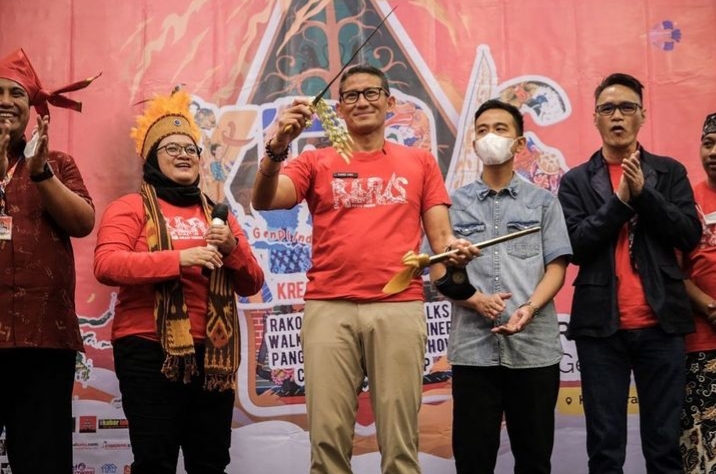 Menparekraf Sandiaga S Uno bersama Walikota Solo Gibran Rakabuming Raka dan Genpi di Solo, Sabtu (5/11/2022).