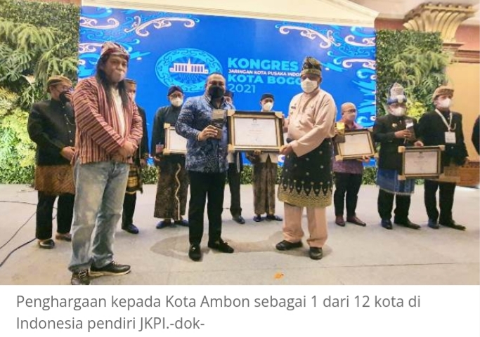 BOGOR–Kota Ambon termasuk saty dari 12 kota di Indonesia yang menerima penghargaan sebagai Kota Deklarasi Jaringan Kota Pusaka Indonesia (JKPI) dalam pembukaan Kongres-V JKPI di Puri Begawan Kota Bogor-Jawa Barat, Jumat (3/12/21).