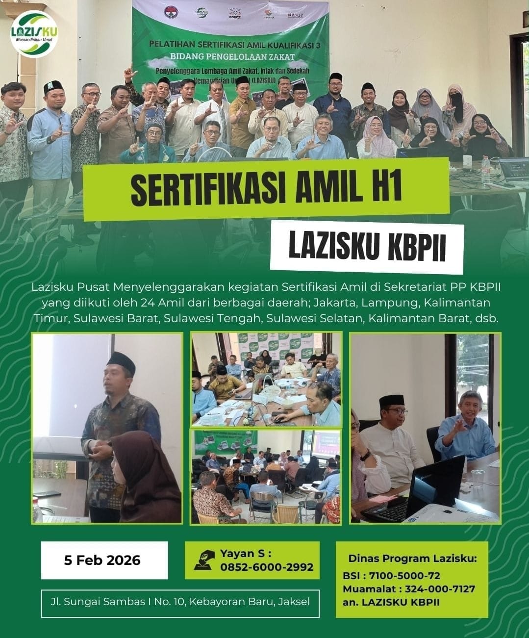 Pelatihan dan uji kompetensi ini dilaksanakan bekerja sama dengan LSP Beksya dan POROZ Institute, dengan materi meliputi pengelolaan ZIS sesuai syariah, manajemen organisasi amil zakat, regulasi zakat, serta akuntansi dan keuangan amil. Sertifikat kompeten dijadwalkan diserahkan pada Februari 2026.