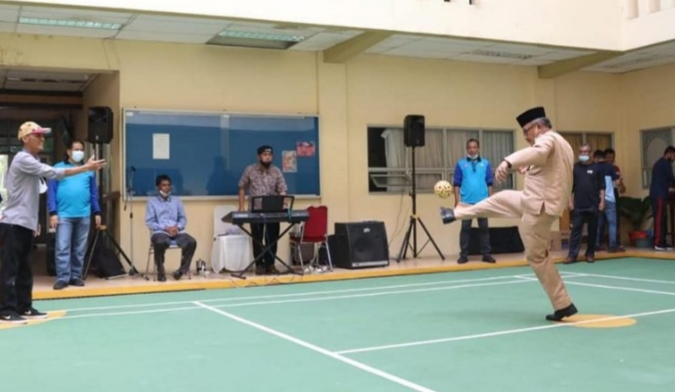BATAM–Dinas Pemuda dan Olahraga (Dispora) Batam menggelar ekshibisi sepak takraw di lapangan Dispora Batam, Jumat (5/3/2021). Pertandingan persahabatan itu dihadiri Sekretaris Daerah (Sekda) Batam, Jefridin Hamid, sekaligus Ketua Persatuan Sepak Takraw Indonesia (PSTI) Batam.