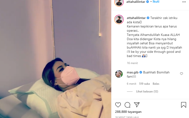 Terakhir cek istriku ada kista. Kemaren kepikiran terus apa harus operasi. Ternyata, Alhamdulillah Kuasa ALLAH Doa kita didengar Kista nya hilang insyallah sehat Bisa menyambut buAHHAti kita nanti ya syg 🖤 Insyallah i’ll be by your side through good and bad times,” ungkap Atta Halilintar bersama unggahan video.