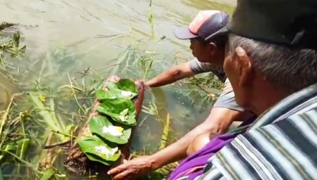 Setelah dibacakan mantra oleh tetua setempat, ayam dan beras yang telah dimasak, dilarung masuk sungai, tempat korban kecelakaan dan dinyatakan hilang.