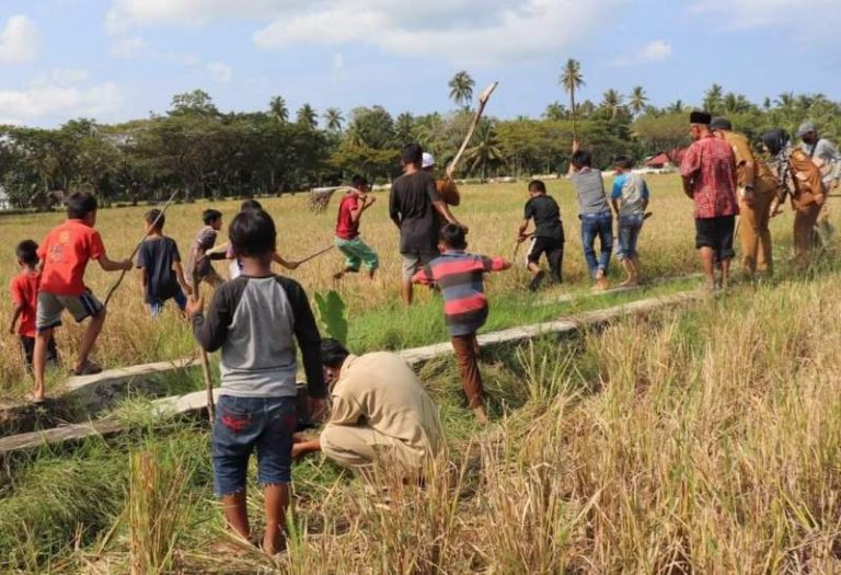 PARIAMAN–Mencegah gagal panen padi, para petani di Desa Marabau, Kecamatan Pariaman Selatan, Kota Pariaman melakukan gotong royong berburu hama tikus (buru mancik) di kawasan persawahan Desa Marabau.