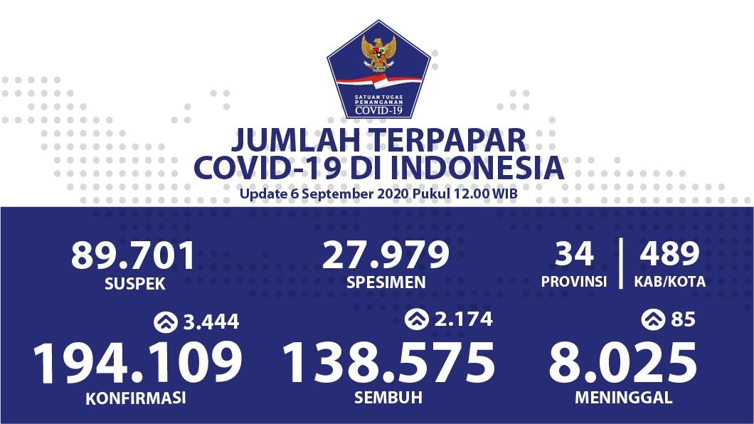 JAKARTA – Satuan Tugas Penanganan Covid-19 mencatat pada Minggu sampai pukul 12.00 WIB terdapat penambahan 3.444 pasien positif corona menjadikan akumulasi konfirmasi Covid-19 di Indonesia mencapai 194.109 orang.
