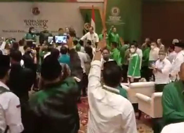 Pernyataan itu langsung disambut sebagian peserta worskshop dengan kepalan tangan disertai takbir Allahu akbar. Meski masih ada teriakan pengusiran, para kader PPP yang hadir memberikan tanda setuju dan dukungan pada pernyataan Suharso Monoarfa.