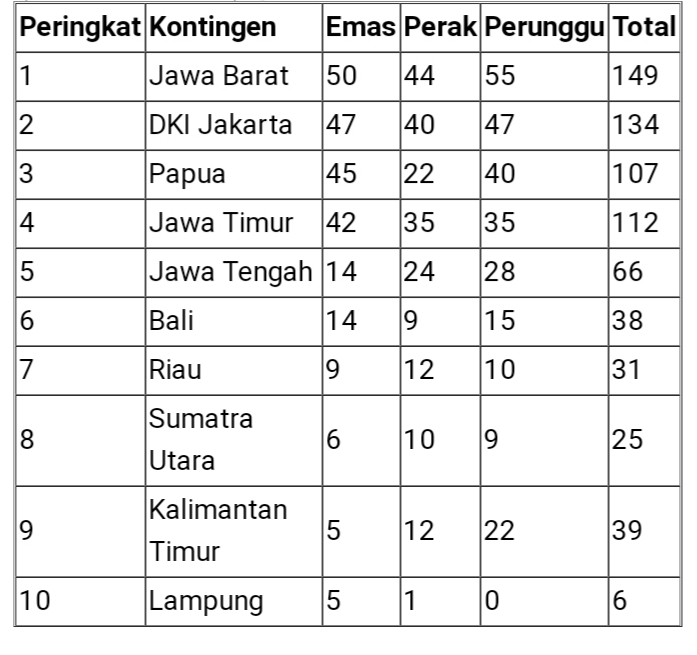 Adapun di bawah Jawa Barat dan DKI Jakarta, menyusul tuan rumah Papua yang menempati peringkat ketiga.
