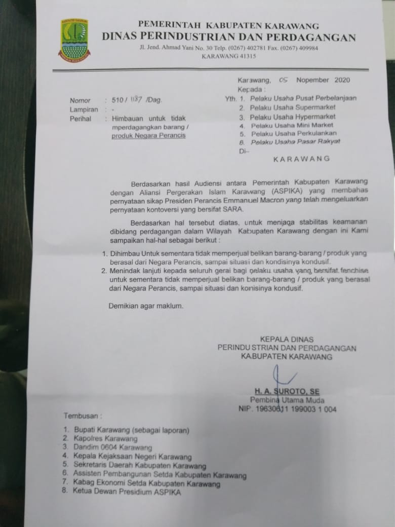 Menanggapi hal tersebut, Kepala Dinas Perindustrian dan Perdagangan (Disperindag) Kabupaten Karawang Ahmad Suroto mengeluarkan surat imbauan untuk memboikot produk Perancis.