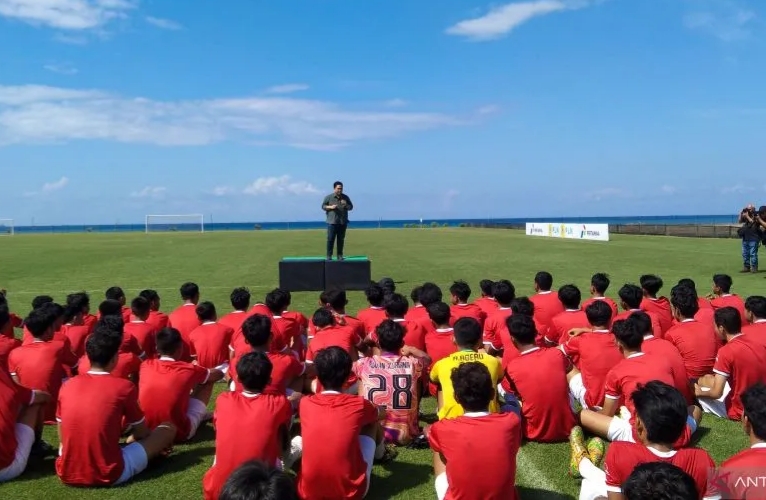 Ketua Umum PSSI Erick Thohir memberi pengarahan kepada peserta seleksi Timnas U-17 di Pemusatan Latihan Bali United di Pantai Purnama, Kabupaten Gianyar, Minggu (16/7/2023). (Antara)