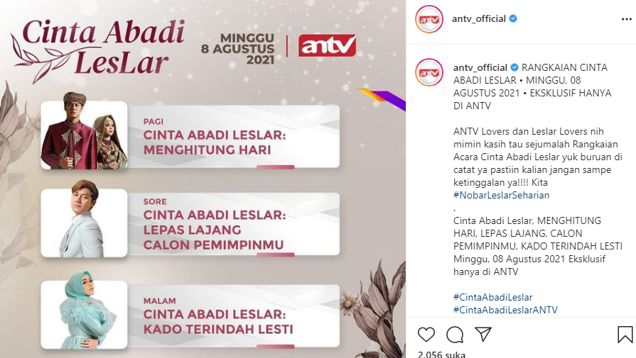 “Setelah menunda selama sebulan lebih lamanya, akhirnya kami dapat mengumumkan hari bahagia yang sudah ditunggu-tunggu oleh penggemar setia Leslar. Semoga seluruh rangkaian acara Cinta Abadi Leslar dapat berja;an sesuai dengan yang kita harapkan,” ungkap Otis Hahijary selaku Vice President Director ANTV melalui rilisnya.
