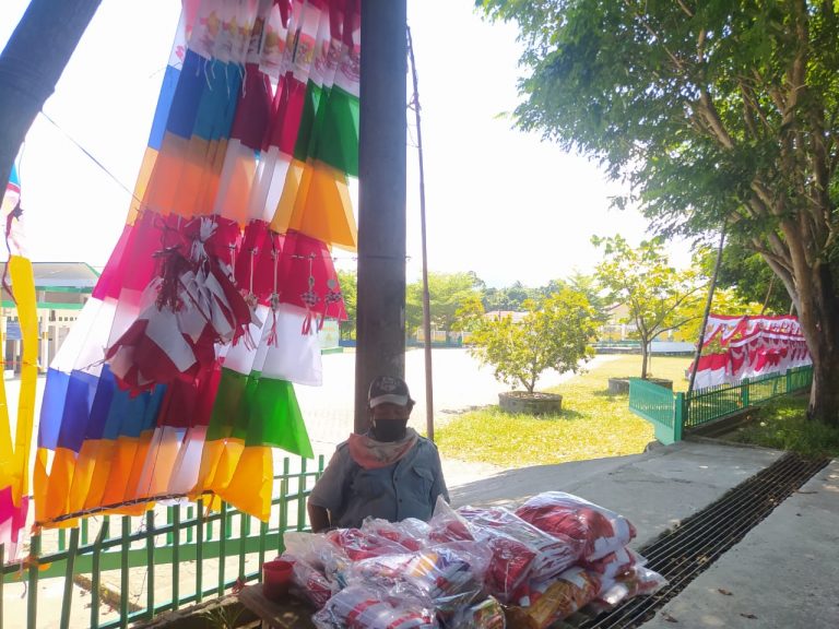 Demikian yang terlihat okeyboz.com, Sabtu (7/8/2021)siang Penjual bendera merah putih yang berlokasi di depan Masjid Baitul, Muntok, Kabupaten Bangka Barat sepi pembeli.