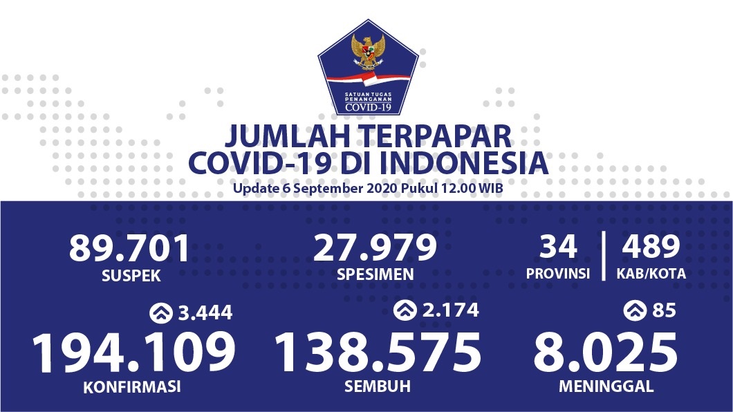 Sementara itu Satuan Tugas Penanganan Covid-19 mencatat pada Minggu sampai pukul 12.00 WIB terdapat penambahan 3.444 pasien positif corona menjadikan akumulasi konfirmasi Covid-19 di Indonesia mencapai 194.109 orang.