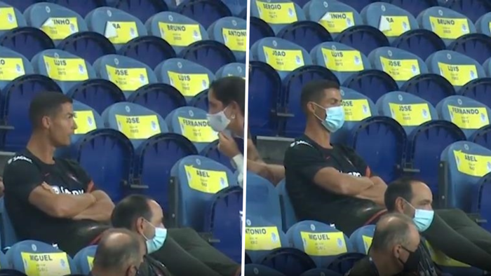 Ronaldo terlihat terganggu dengan adanya teguran dari sang petugas, tapi kemudian langsung mencari masker dan memasangnya hingga akhir pertandingan.