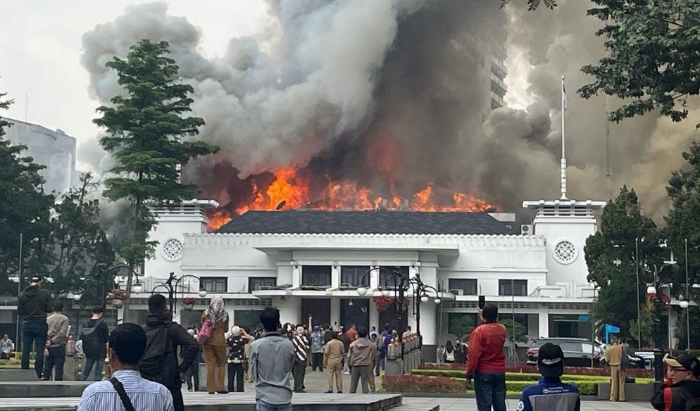 Hujan yang mengguyur Balai Kota Bandung juga belum mampu memadamkan api yang berkobar.