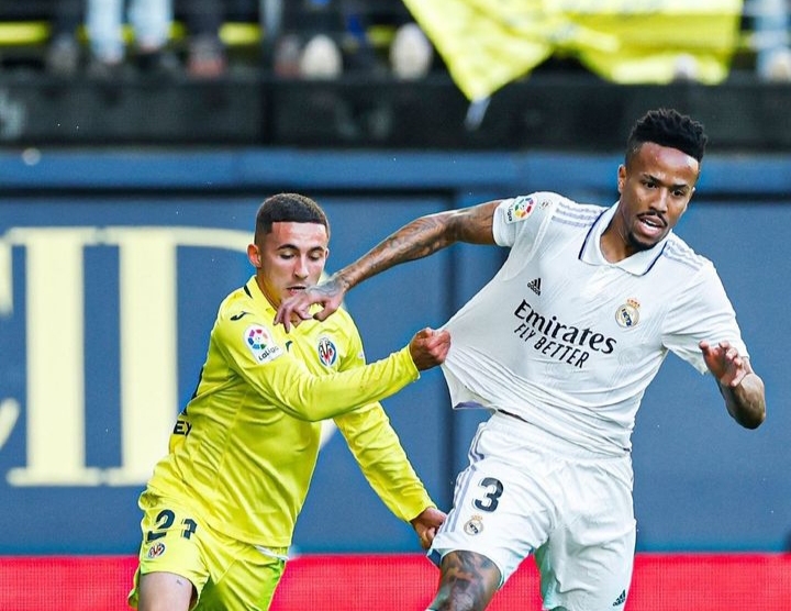 Pemain Villareal Yeremy Pino berusaha menghentikan pergerakan pemain Real Madrid Eder Militao dalam laga pekan ke-16 Liga Spanyol di Stadion De La Ceramjca, Sabtu (7/1/2023) malam WIB.(Instagram @realmadrid)