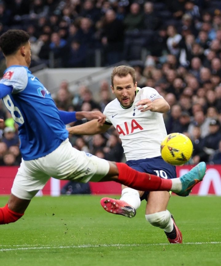 Penyerang Tottenham Hotspur Harry Kane berebut bola dengan pemain Portsmouth saat pertandingan putaran ketiga Piala FA di London, Sabtu (7/1/2023). (Instagram @spursofficial)