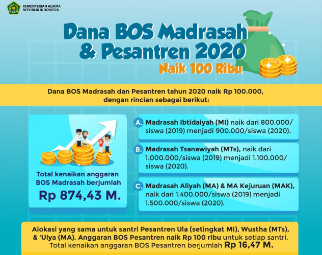 Anggaran untuk bantuan Operasional Sekolah di Madrasah dan Pesantren sianggarkan di DIPA Kemenag tahun 2020 mengalami peningkatan. Untuk sekolah Madrasah Ibtidaiyah (MI) naiknya dari Rp800.000 per siswa pada 2019 menjadi Rp900.000 persiswa pada 2020 ini. Sementara Madrasah Tsanawiyah (MTs), kenaikannya dari Rp1.000.000 per siswa pada 2019 menjadi Rp1.100.000 per siswa tahun ini. Adapun BOS Madrasah Aliyah (MA) dan MA Kejuruan (MAK), naik dari Rp1.400.000 per siswanya pada 2019 kini sudah menjadi Rp1.500.000 persiswa. Total kenaikan anggaran BOS Madrasah mencapai Rp874,4 miliar.