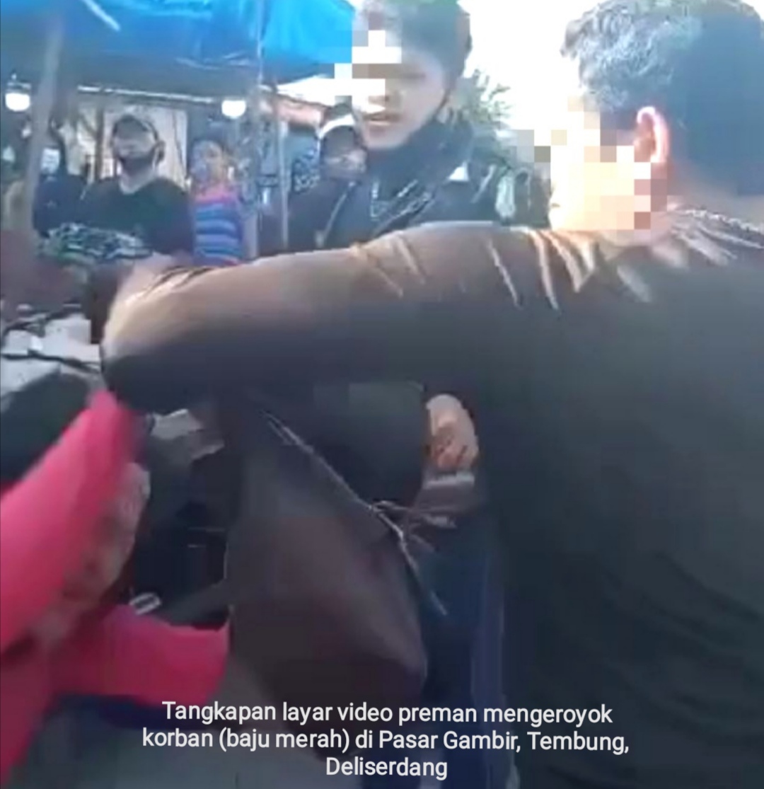 DELISERDANG – Seorang wanita pedagang di Pajak Gambir, Kecamatan Percut Seituan, Kabupaten Deliserdang, Liti Wari Iman Gea (37), babak belur dikeroyok preman Bn Cs, Minggu (5/9/2021).