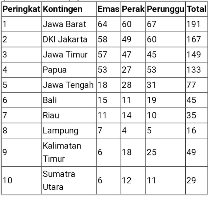 Jawa Barat berada di urutan teratas dengan total medali 191 keping yang terdiri atas 64 emas, 60 perak, dan 67 perunggu.