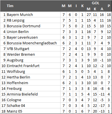Berikut jadwal dan hasil Liga Jerman pekan ketujuh (dalam WIB, tuan rumah disebut pertama):