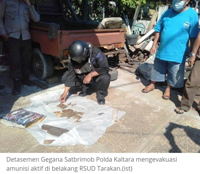 TARAKAN – Tim unit penjinak bom Detasemen Gegana Satbrimob Polda Kaltara melakukan evakuasi sejumlah amunisi yang ditemukan warga Jalan Pulau Bangka RT14, tepatnya di belakang RSUD Kota Tarakan, Kalimantan Utara (Kaltara) pada Sabtu (7/11/2020).