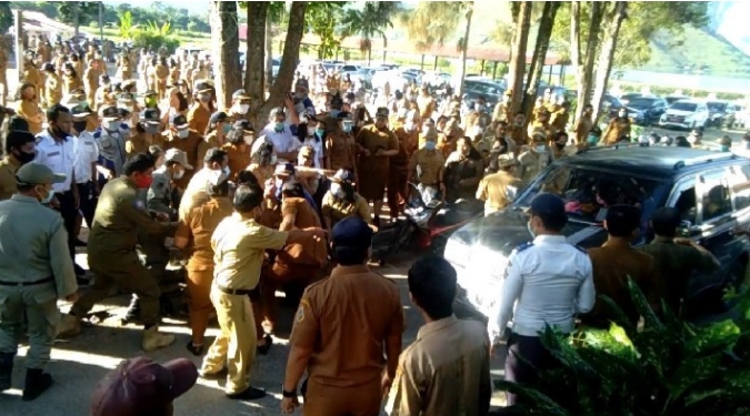 Tampak beberapa pegawai yang mengikuti apel pagi panik bercampur takut, melihat ada seseorang terjatuh.